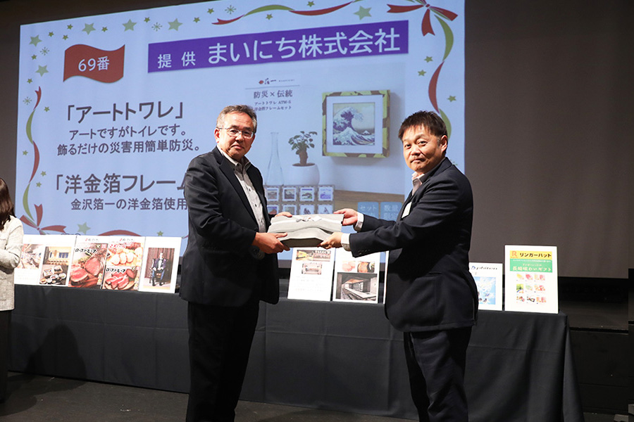 まいにち様からは、アートとして楽しめる非常用トイレ「アートトワレ」の洋金箔フレーム版。会員企業の箔一様とコラボして誕生した商品をご提供いただきました。